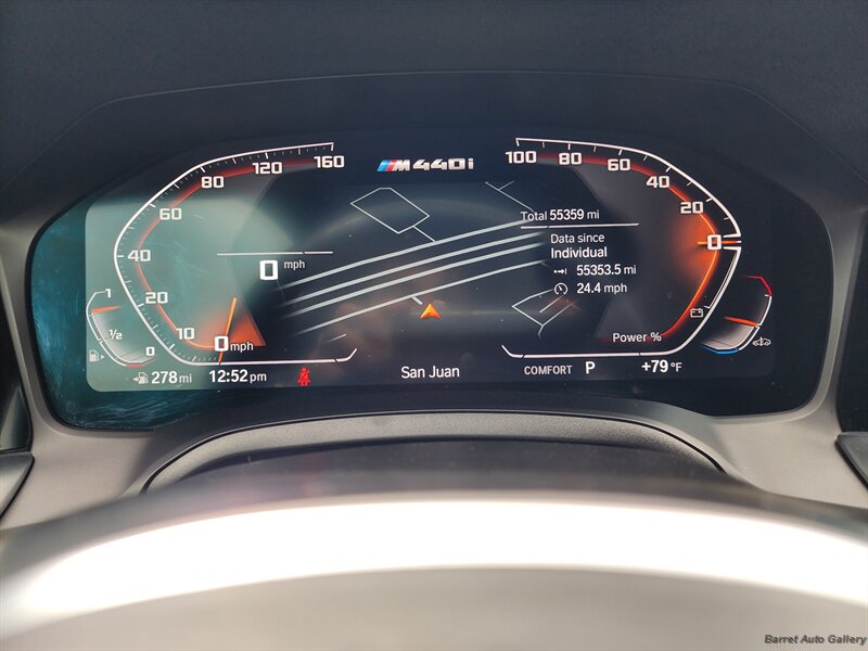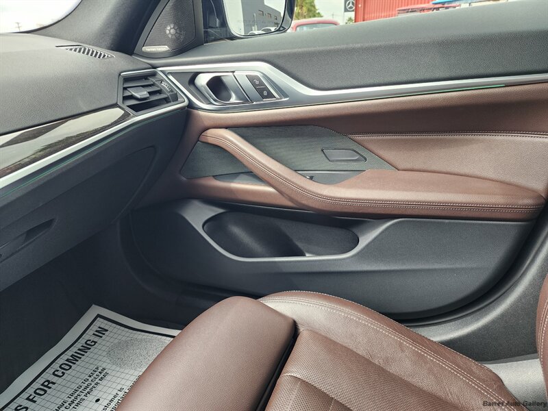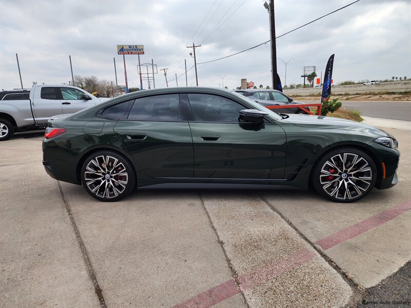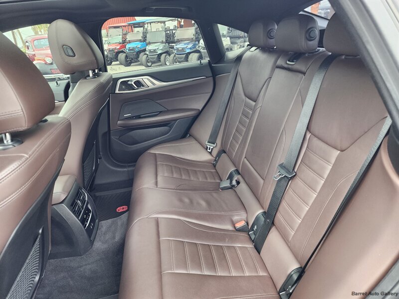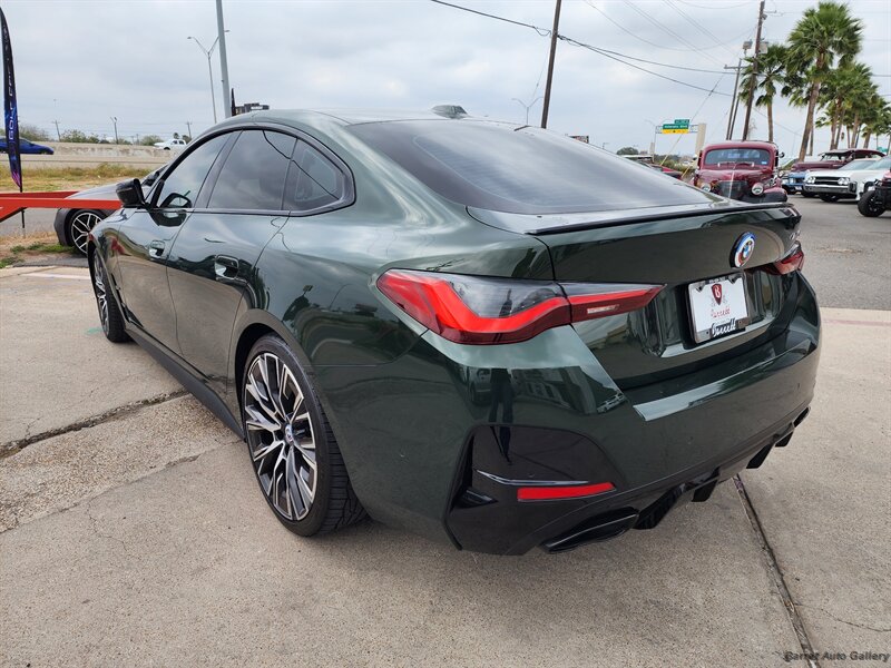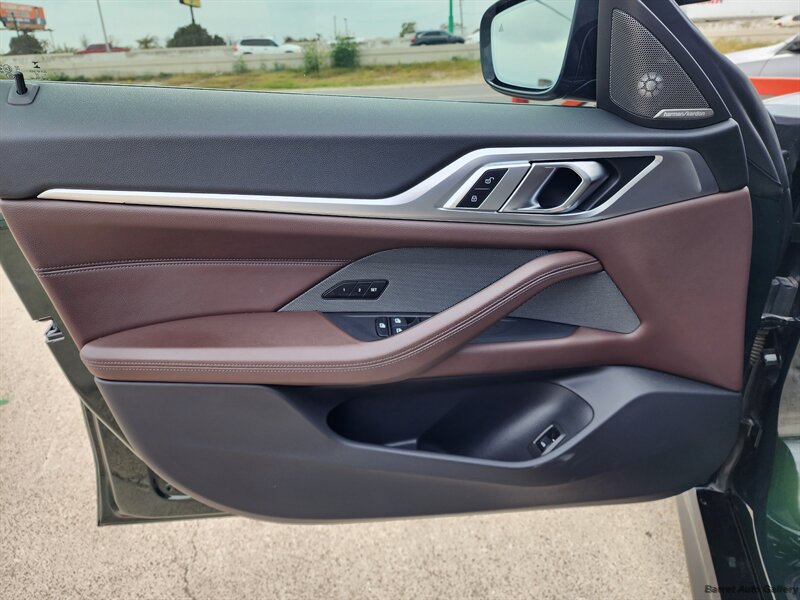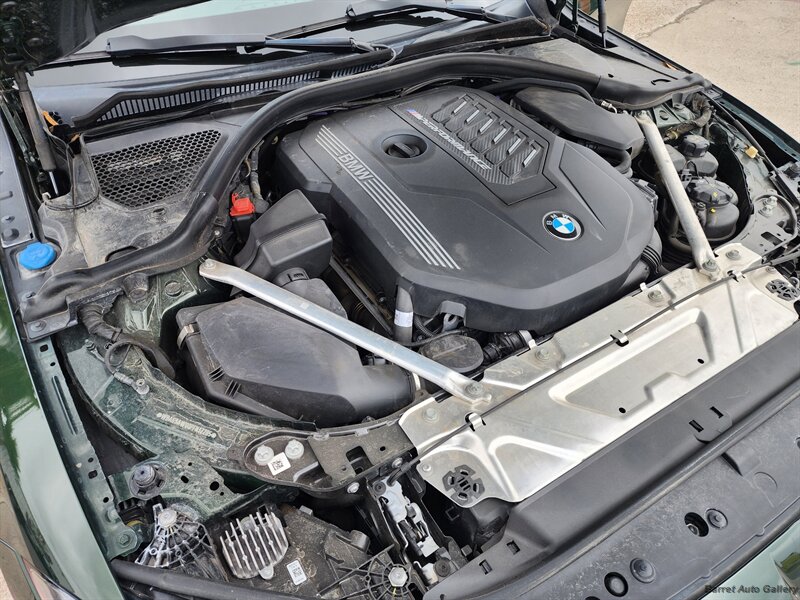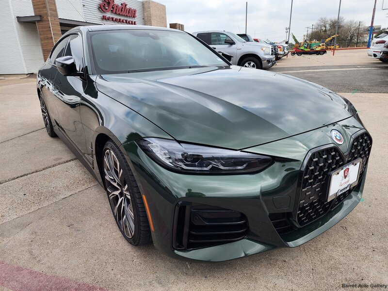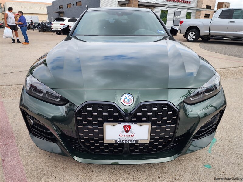 2023 BMW M440i Gran Coupe in San Remo Green Metallic with Tacora Red interior. Powered by a 3.0L mild-hybrid turbocharged inline-6 producing 382 hp and 369 lb-ft, paired with BMW’s 8-speed automatic; EPA-rated 24 MPG city / 32 MPG highway. Factory equipment includes the mild-hybrid drivetrain, Tacora Red leather seating, power-adjustable front seats with memory, dual-zone automatic climate control, panoramic glass roof, BMW Live Cockpit Professional with digital instrument cluster and central touchscreen navigation, Apple CarPlay/Android Auto and Bluetooth connectivity, LED headlights, rearview camera with front/rear parking sensors, keyless entry with push-button start, and a full complement of airbags and stability/traction controls. Vehicle is in excellent overall condition with a clean CARFAX.
